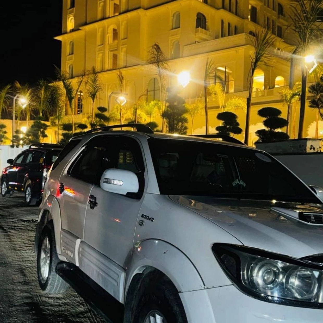Toyota Fortuner, a white SUV shown under bright lighting, possibly at night or in an indoor setting. The Fortuner is a premium full-size SUV known for its rugged build and powerful performance, often used for off-roading, long-distance travel, and executive transport. This section promotes expert detailing services for SUVs and various ot