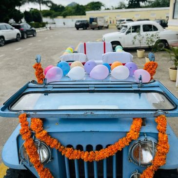 Modified Open Jeep, painted blue and decorated with colorful balloons and orange flower garlands. Its festive decoration suggests it’s used for events like weddings or celebrations. The Jeep has an open-top design with a classic, rugged appearance. This section focuses on accessibility, customer service, and a hassle-free experience, especially for vehicles used in special occasions.
